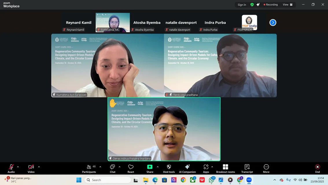 At the fifth session of short courses, Nur Rahma Asri Saraswati as CMO of Agradaya talked about social enterprises as catalysts of regenerative tourism. This session was moderated by Rendy Ega Pradhana, M.B.A. as a lecturer of Universitas Diponegoro. Asri introduced Agridaya Indonesia that was founded in 2017. Basically Agradaya Indonesia is dedicated to empowering rural communities through sustainable agriculture and the production of premium spice and herbal products. Agradaya Indonesia works closely with local farmers and employs eco-friendly methods such as Natural Agriculture, Solar Dome drying technology, and fair pricing initiatives. Agradaya’s products cater to various sectors including retail, food, extraction, and pharmaceuticals, positioning the company as a leader in ethical and regenerative agribusiness.