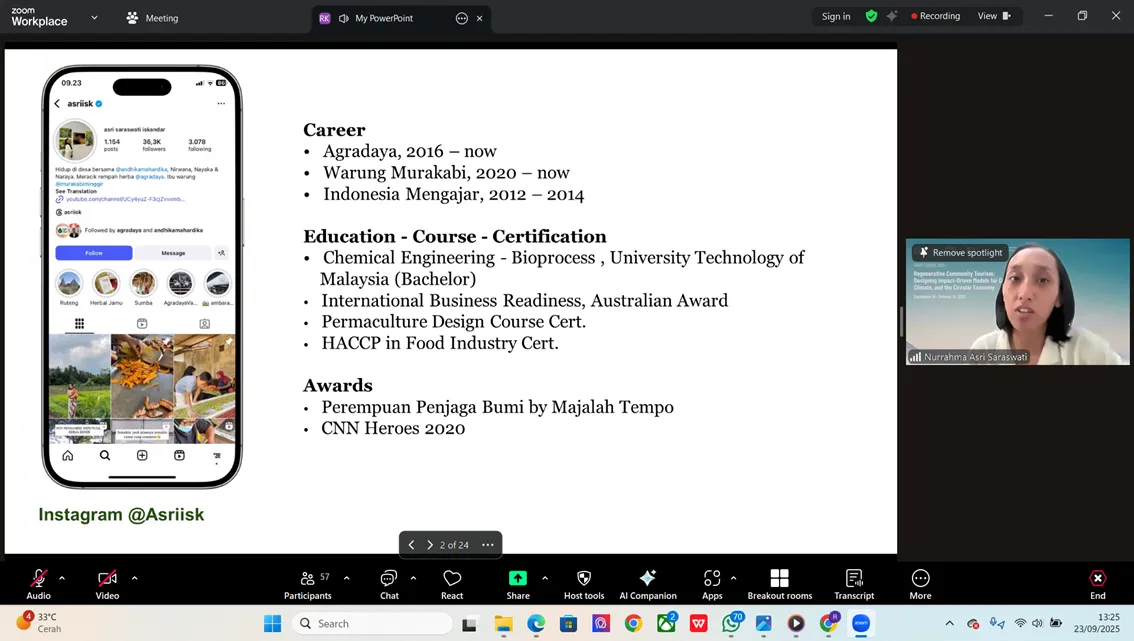 Asri explained the role of social enterprises based on her experiences. She divided it into three parts arranged in a pyramid. The base layer is to ensurring local wisdom, traditions, and natural resources remain central. The mid layer is about agroforestry as the economic and sustainability foundation. And the top layer is about regenerative tourism. In addition, she also discussed a journal she read related to “Agritourism As a Catalyst for Sustainable Rural Development” and gave some key findings.