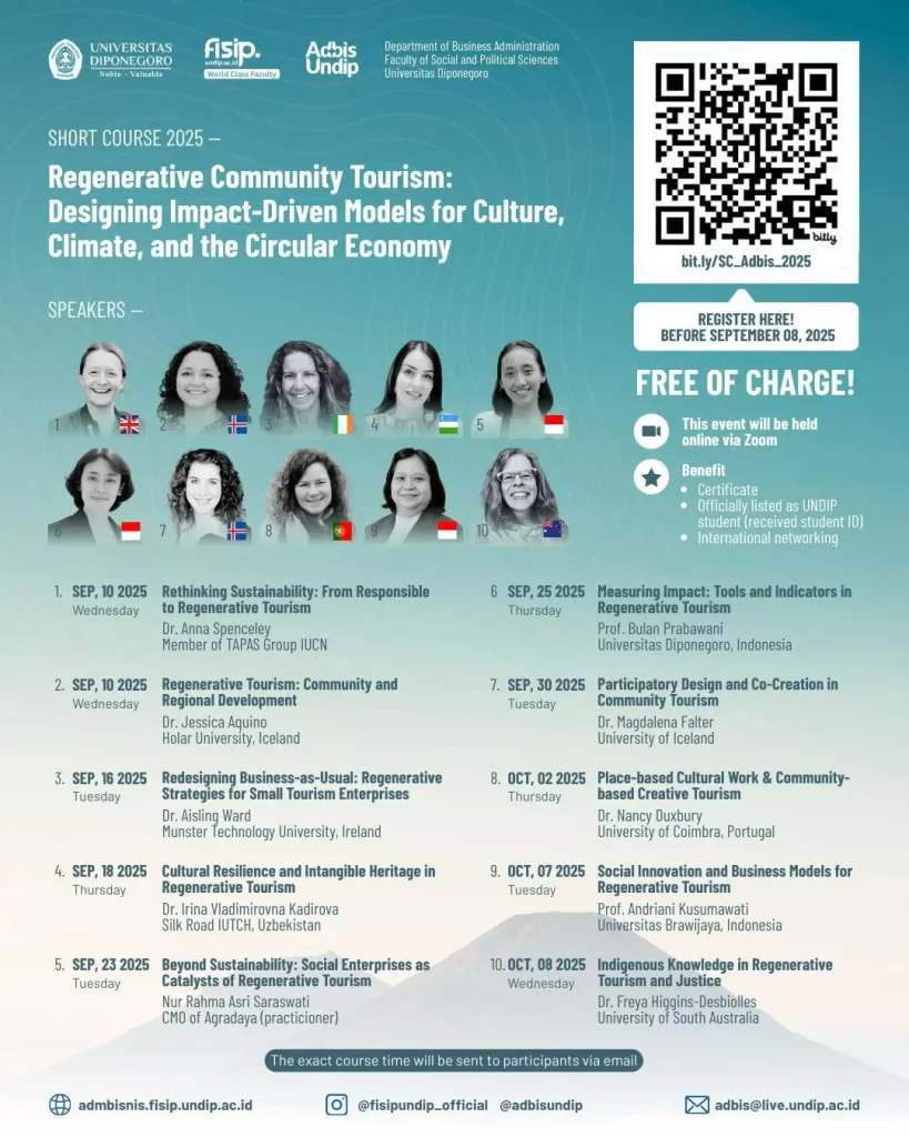 Join Regenerative Community Tourism: Designing Impact-Driven Models for Culture, Climate & the Circular Economy; a 10-session program hosted by the Department of Business Administration, FISIP Universitas Diponegoro.