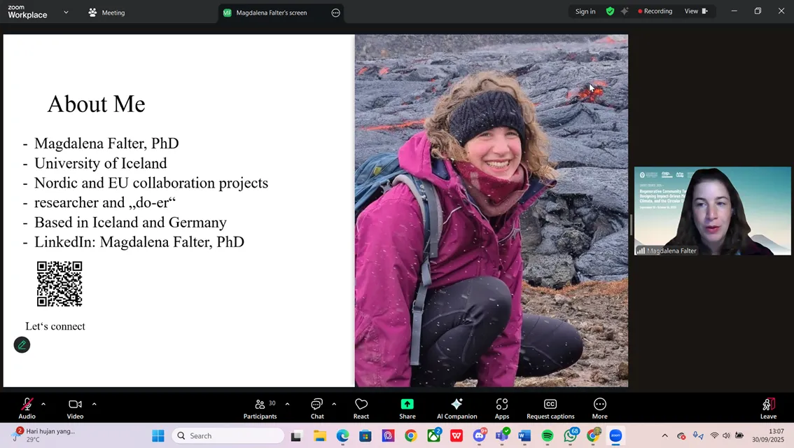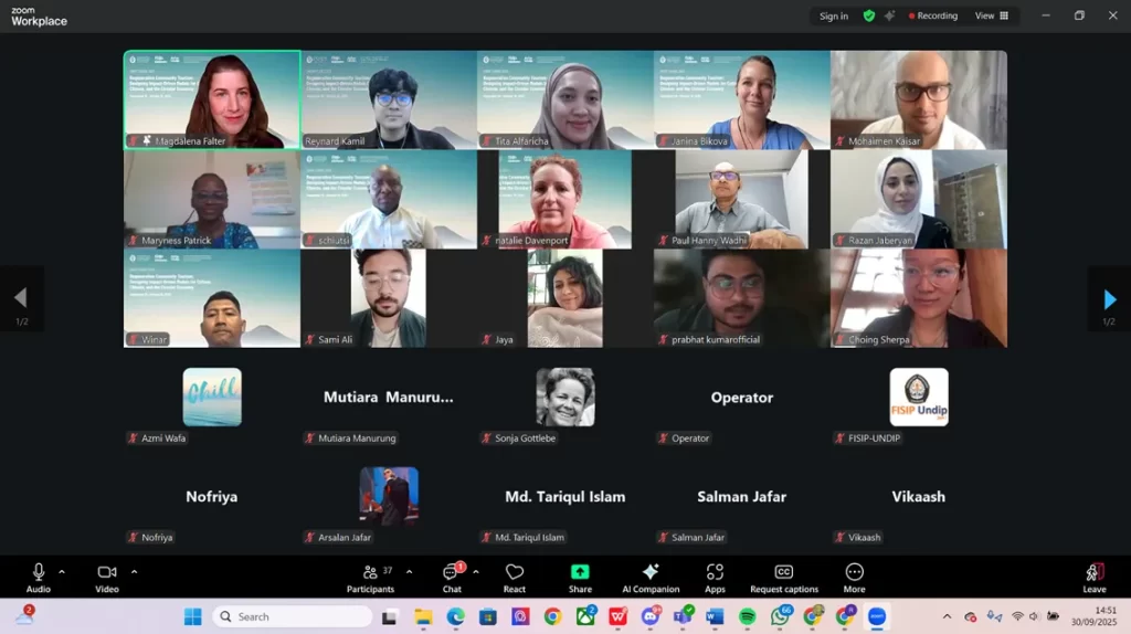 Di tengah sesi, Magdalena melibatkan peserta dalam aktivitas interaktif dengan membagi mereka ke dalam beberapa kelompok dan memberikan pertanyaan diskusi terkait materi yang telah disampaikan. Setiap kelompok yang terdiri dari peserta dari berbagai negara membahas topik seperti praktik baik dan buruk pariwisata regeneratif dari negara mereka, serta berbagi perspektif dan pengalaman dari konteks pariwisata yang berbeda. Keragaman sudut pandang ini menghasilkan diskusi yang kaya dan berwawasan mengenai bagaimana pendekatan regeneratif dapat diimplementasikan secara efektif sekaligus menghindari kesalahan umum. Setelahnya, setiap kelompok mempresentasikan kesimpulan mereka, dan Magdalena memberikan penjelasan serta refleksi tambahan untuk memperdalam pemahaman bersama.