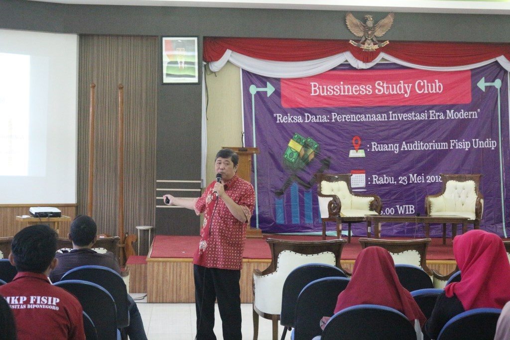 Bapak Marwahjudi Wonoatmodjo sebagai Branch Manager Panin Sekuritas Semarang memberikan pengarahan mengenai kondisi ekonomi negara Indonesia dari waktu ke waktu, serta menjelaskan bentuk-bentuk bisnis yang bisa diterapkan oleh seorang mahasiswa maupun masyarakat secara umum dan salahsatunya yaitu melalui reksadana.