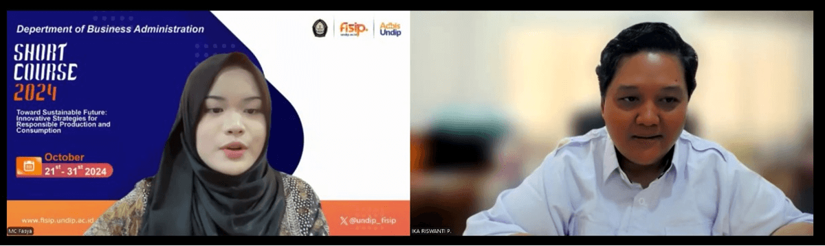 Semarang, 21 Oktober 2024 – Departemen Administrasi Bisnis Universitas Diponegoro resmi memulai kegiatan Short Course bertajuk “Toward Sustainable Futures: Innovative Strategies for Responsible Production and Consumption”, yang berlangsung pada 21 Oktober hingga 30 Oktober 2024. Pembukaan kegiatan ini dilaksanakan pada pukul 13.50 WIB, diawali dengan sambutan dari Ketua Panitia, Anis Qomariah, M.Ling, dan resmi dibuka oleh Wakil Dekan II Bidang Sumber Daya, Ibu Ika Riswanti Putranti, Ph.D.