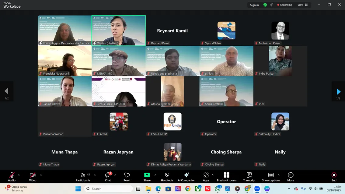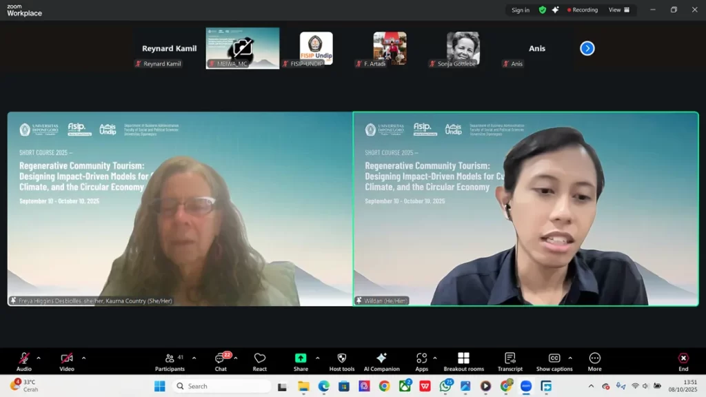 At the last session of the Short Course 2025, Dr. Freya Higgins-Desbiolles from the University of South Australia delivered a compelling presentation titled “Regenerative Tourism and Indigenous Knowledges: Appreciation, Appropriation and Allyship.” The session was moderated by Wildan Namora Ichsan Setiawan, S.I.Kom., M.Sc. , a lecturer in Communication Science at Universitas Diponegoro.