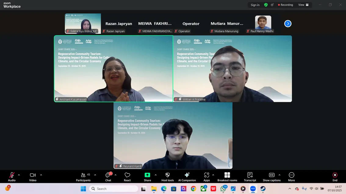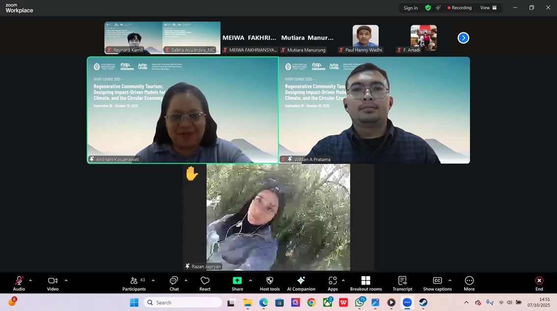 In the ninth session, Prof. Andriani Kusumawati, S.Sos., M.Si., DBA of Universitas Brawijaya delivered a theme about “Social Innovation and Business Models For Regenerative Tourism” and moderated by Wildan Pratama Avian S.A.B., M.A.B. as a lecturer at Universitas Diponegoro. Prof. Andriani introduced a transformative vision for the future of global tourism. She emphasized the urgent need to shift from traditional and sustainable tourism models toward regenerative tourism where a paradigm not only minimizes harm but also actively restores ecosystems, empowers local communities, and enhances cultural heritage.